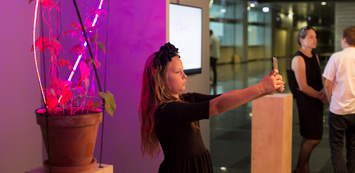 Runā ar mani" ir mākslinieku Rasas Šmites un Raita Šmita mākslas pētījums par cilvēku un augu komunikāciju, kas īpaši tiecas izzināt attiecības starp dabu un cilvēkiem, bioloģiju un tehnoloģijām, bioloģiskajiem un sociālajiem procesiem. Interaktīvās izstādes centrā ir cilvēku komunikācija ar augošām pupām, un mākslinieki uzdod jautājumu: “Vai augi aug labāk, garāki un skaistāki, ja cilvēki ar tiem runā?”