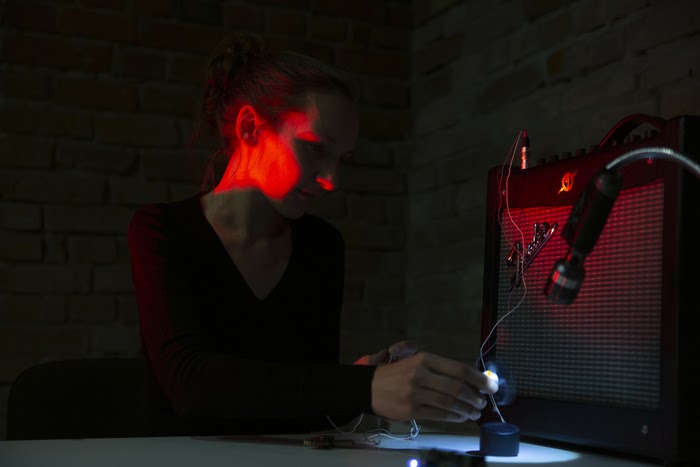 Māksliniece Paula Vītola, veicot eksperimentus ar gaismu un skaņu, mākslas pētījumu laboratorijā MPLab. Foto: Maija Demitere.