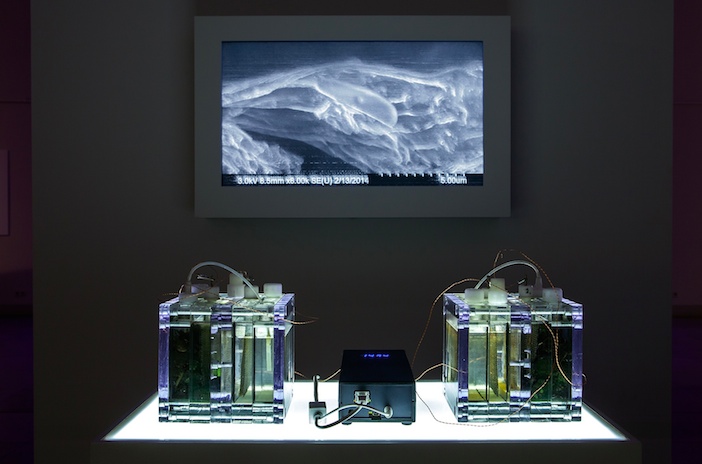Biotricity is an art-science research that uses negotiations with living microorganisms for free electricity. Bacteria, who live in a mud, water sediment, waste, soil, inside of our bodies, that is, everywhere where they can 'eat' organic matter and where there is nearly no oxygen, release free electrons. For several years RIXC artists, together with scientists, have experimented with MFC (microbial fuel cells), the next generation biotechnology – monitoring bacterial activity in dark gallery spaces, organizing public DIY workshops on how to build 'bacteria batteries', and installing bio-energy 'power-stations' outdoors in ponds. In a result, the art installation was created, consisting of a double cell “bacteria battery” that interprets bacteria fuel generation process into live sound and image structures. Thus Biotricity is providing an aesthetic perspective on the interaction between nature and technology, ecological systems and electronic networks, human and micro-worlds.